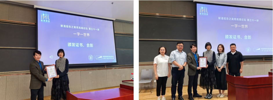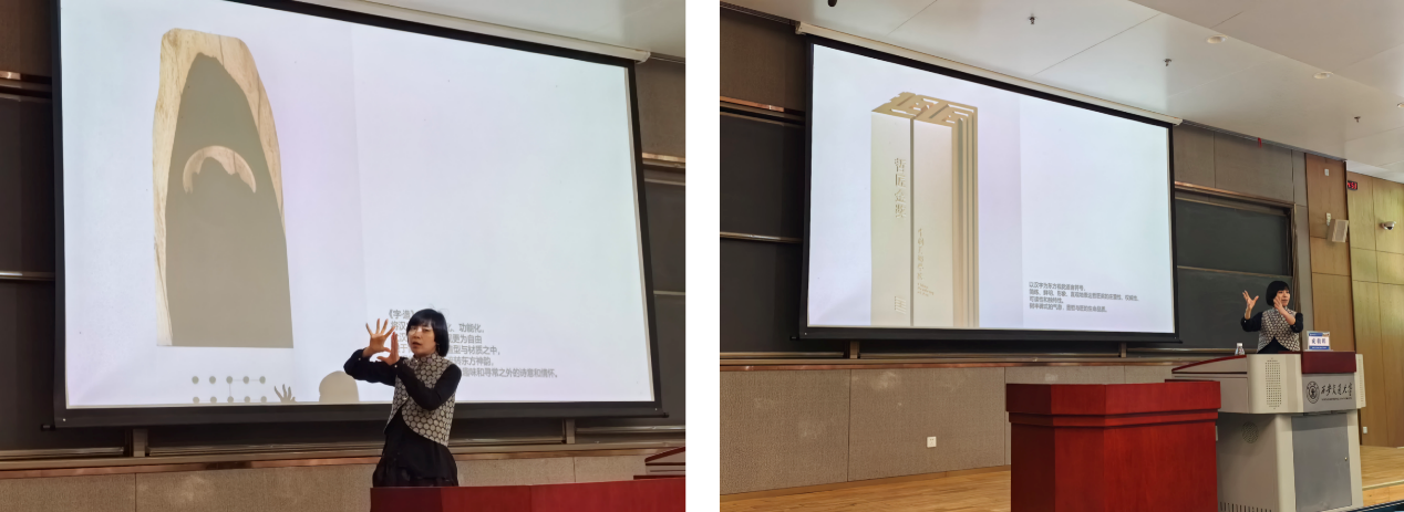成朝晖教授从思辨逻辑、实践路径、感官体验到设计方法与工艺实现,层层递进地分享了以汉字为载体涵养审美素养的创作思路,阐释了如何以身体感知与心性体悟驱动创作实践,推动汉字设计理念与造物方法的迭代更新。她表示,汉字设计的核心价值,在于通过设计实践传递中华美育精神,让中华优秀传统文化在当代设计语境中焕发新的生命力。