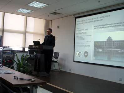 根据中国社会科学院与英国学术院(British Academy)的协议,英国著名学者,当代国际信息哲学(Philosophy of Information)的积极倡导者和创始人弗洛里迪(Luciano Floridi)教授,应邀于2008年9月21日至30日在中国进行了访问,共做了五场系列学术讲演。其中在北京进行了四场,分别在中国社科院、北京大学、中国人民大学、北京理工大学。应我校国产探花