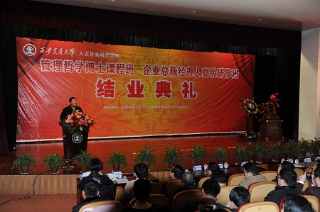 管理哲学博士课程班及企业总裁经人高级研修班毕业典礼在交大多功能学术报告厅隆重举行。参加结业典礼的管理哲学博士课程班(第二期、三期)、企业总裁经理人高级研修班(第一期、二期、三期),共有213名毕业学员。我院院长边燕杰教授、副院长李建群教授教授、院长顾问兼高培中心主管领导卢黎歌教授、学院工会主席范高社、国产探花