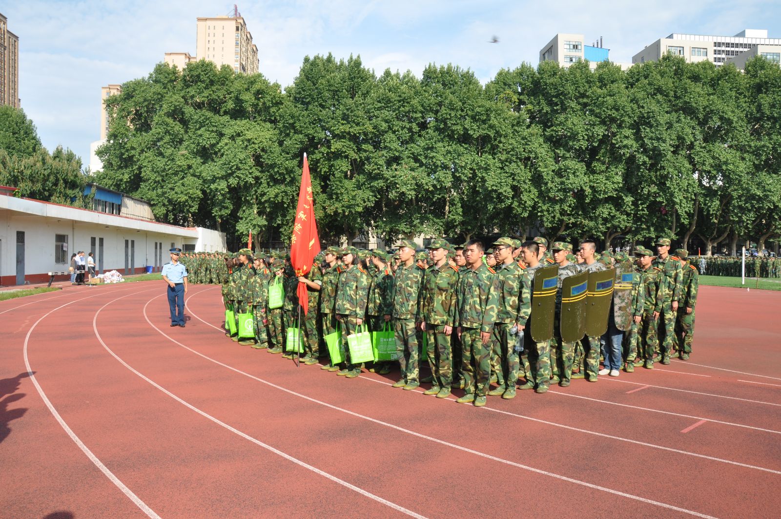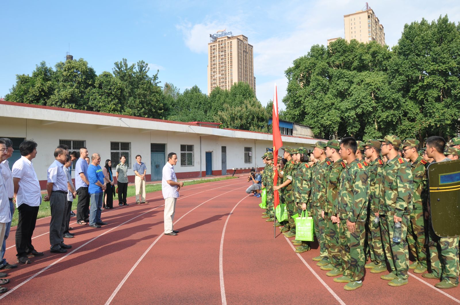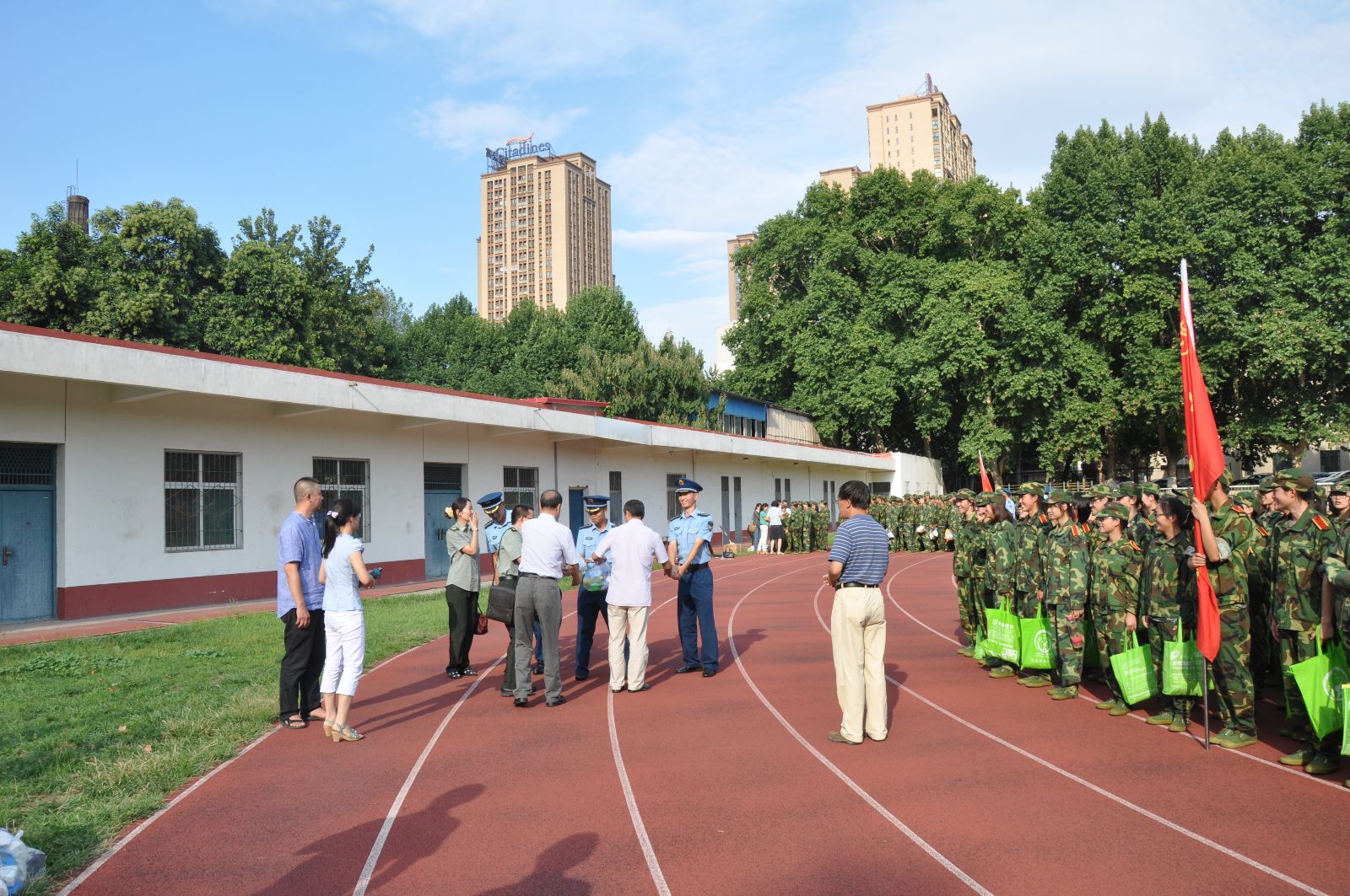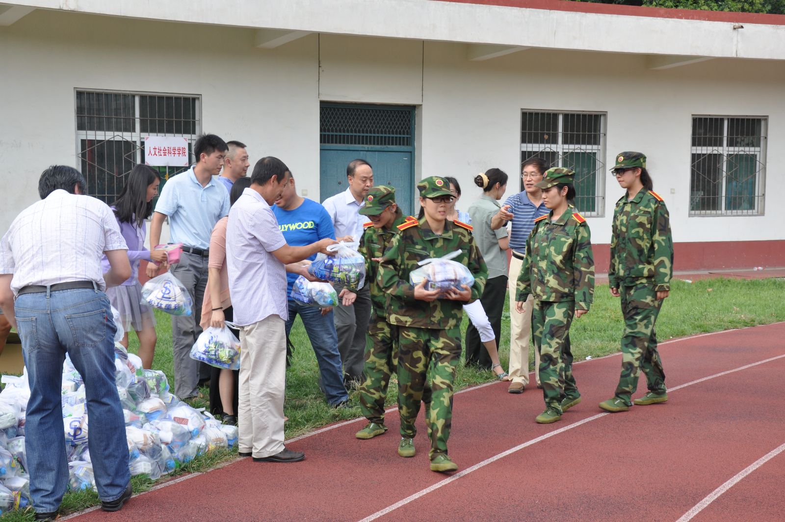 在马书记鼓舞士气的致辞之后,由马晓彬书记和李黎明副院长代表学院向军训教官发放慰问品,感谢他们对学员们的严厉教导。接下来,各位领导及老师向新生们发放了慰问品,并和他们进行了亲切的交谈,让新生们感受到了学院的关怀和温暖。