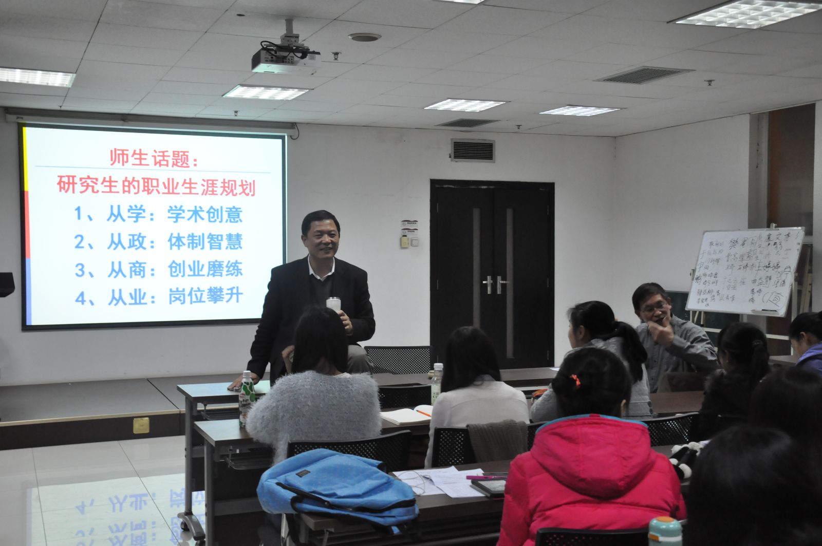 2015年1月8日晚,边燕杰院长为2014级全体新生做“职业生涯发展与规划导论”讲座,在主楼E-703报告厅开讲。讲座由学院副书记宋永平老师主持。