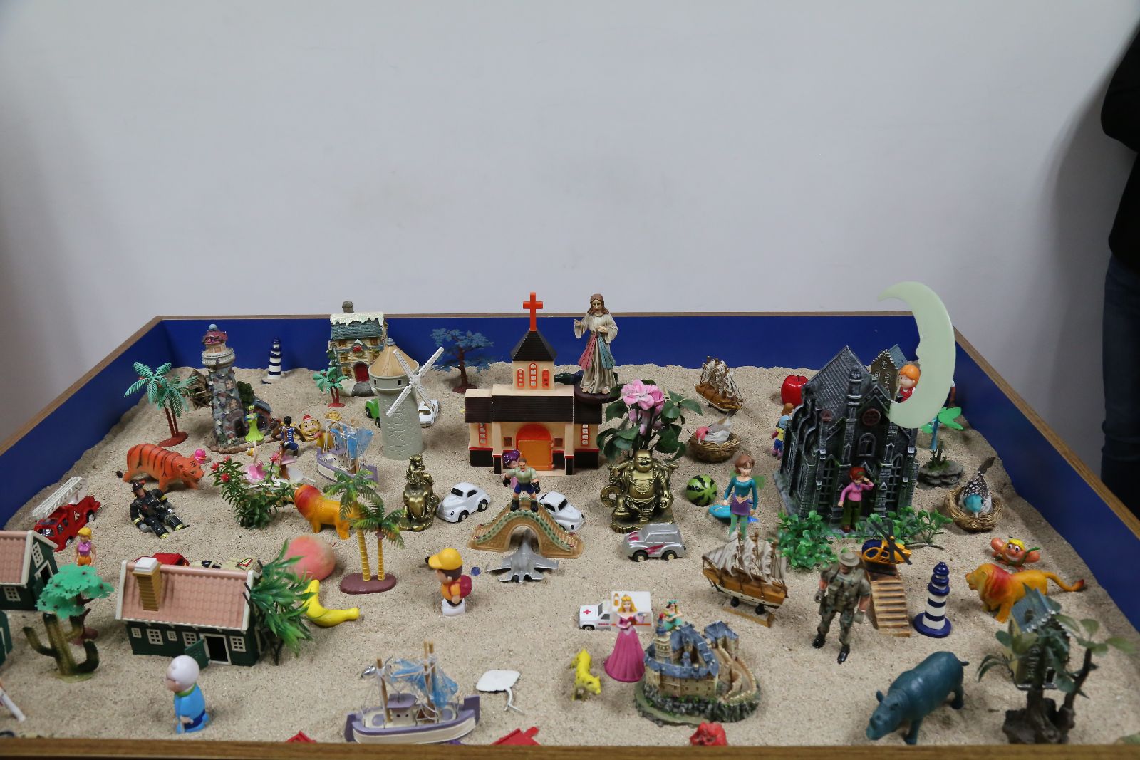 闫老师将同学们带到了沙盘实验室,花草、虫鱼、鸟兽、建筑各种小工艺品整整齐齐的摆放在玻璃柜中。闫老师让每位同学依次拿自己想要的东西放在沙盘内,期间,不允许和别人商量,只能按自己的第一直觉摆放,等到觉得不需要摆什么时就可以停下来。随着活动的进行,原本空空的沙盘被大家摆的满满当当,有美女与野兽的童话故事,有正义与邪恶的激烈对战,有树下身姿悠扬的舞者,还有属于每个人的各式各样的房子,十几次的循环过后,一个充满生机的“海滨小镇”搭建完毕。