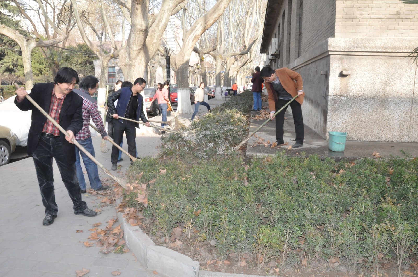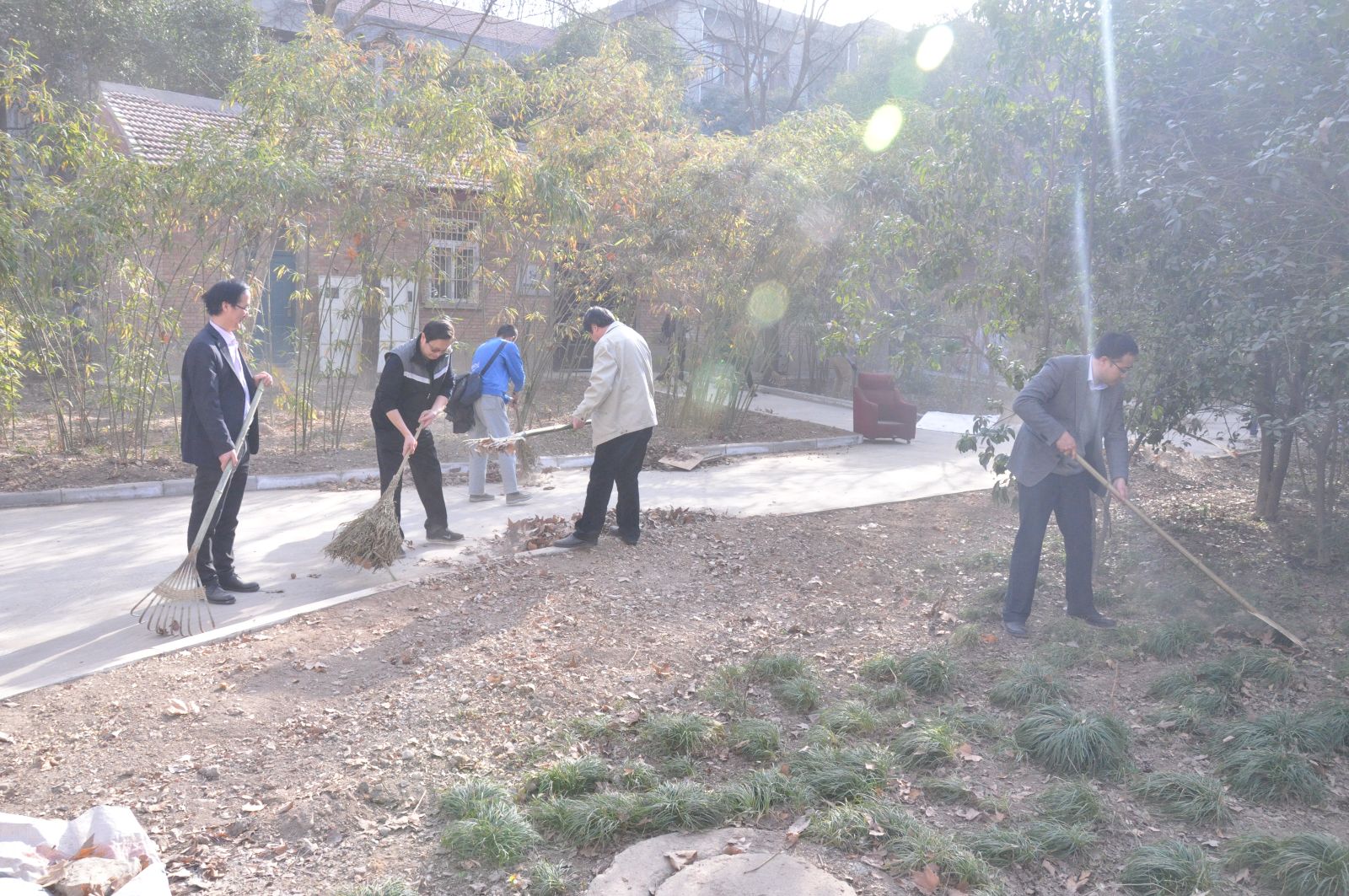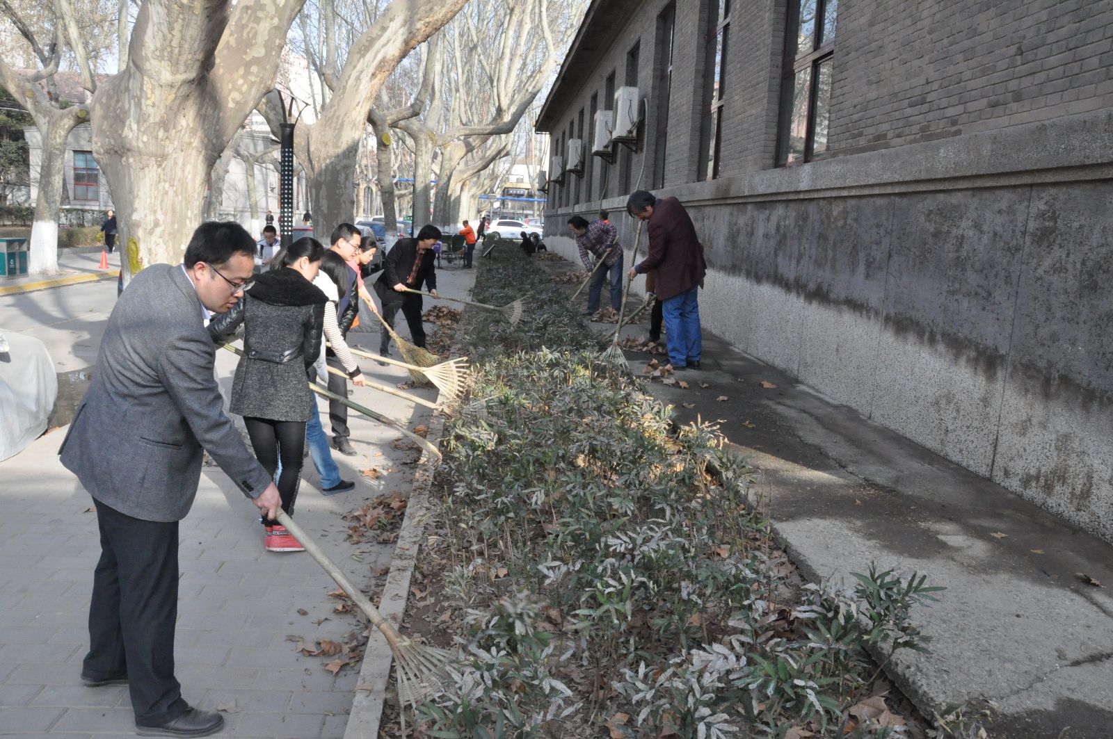 整洁校园环境迎校庆活动拉开序幕。在学院领导和7个系主任、支部书记的带领下,60多名教职员工齐上阵,大家人手一把耙子或扫帚,将绿花带、草坪以及小竹林中的落叶等垃圾清理出来。整个东二楼区域一派热火朝天的劳动景象。大家不怕脏不怕累,说说笑笑边劳动边交流,纷纷表示这样的集体劳动很有意义,表现出大家对学校发展的热爱,对双甲子校庆的期盼,更体现出作为交大人的责任感和使命感。