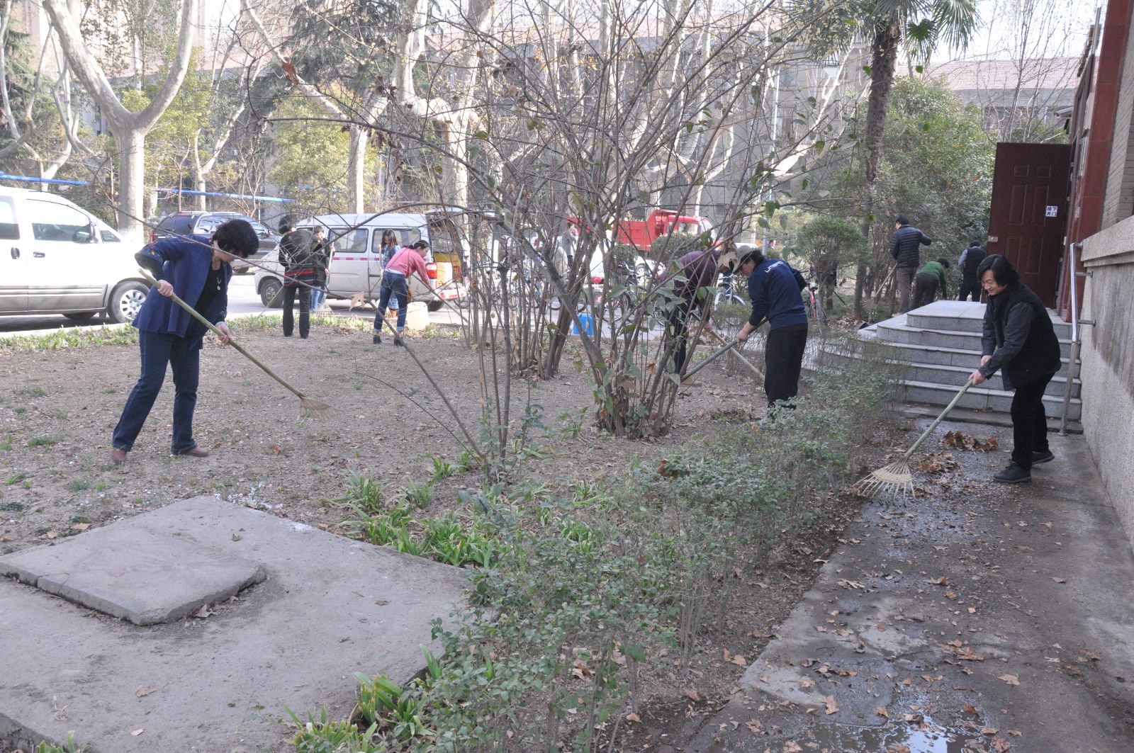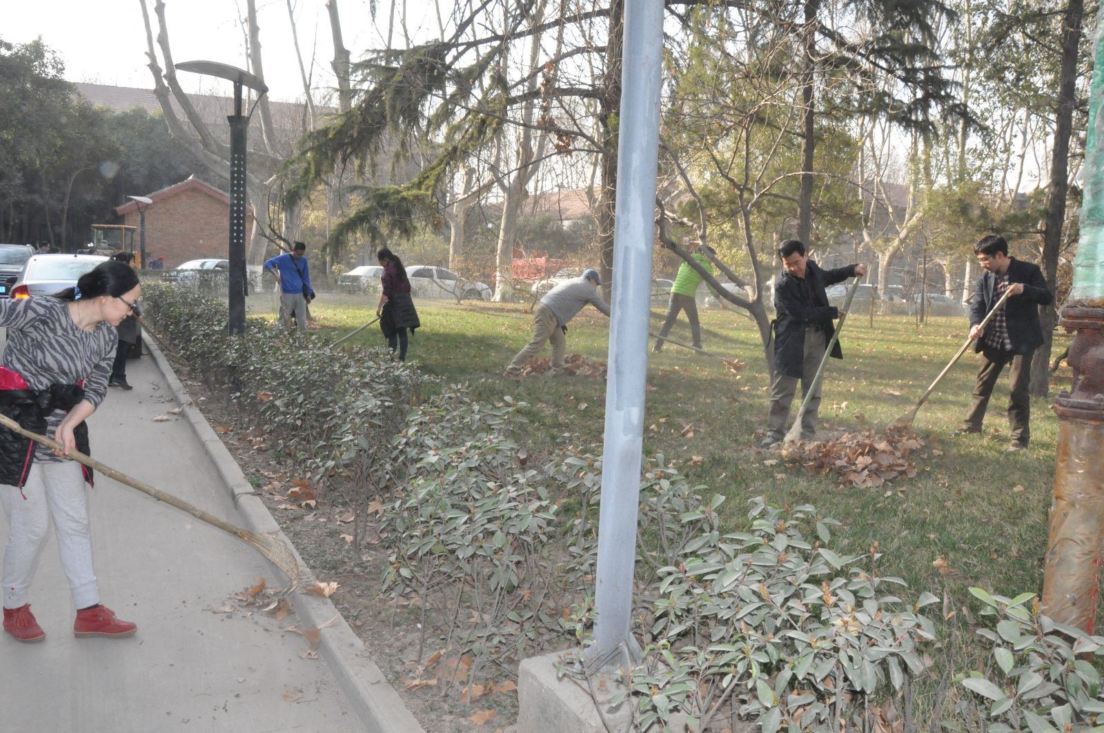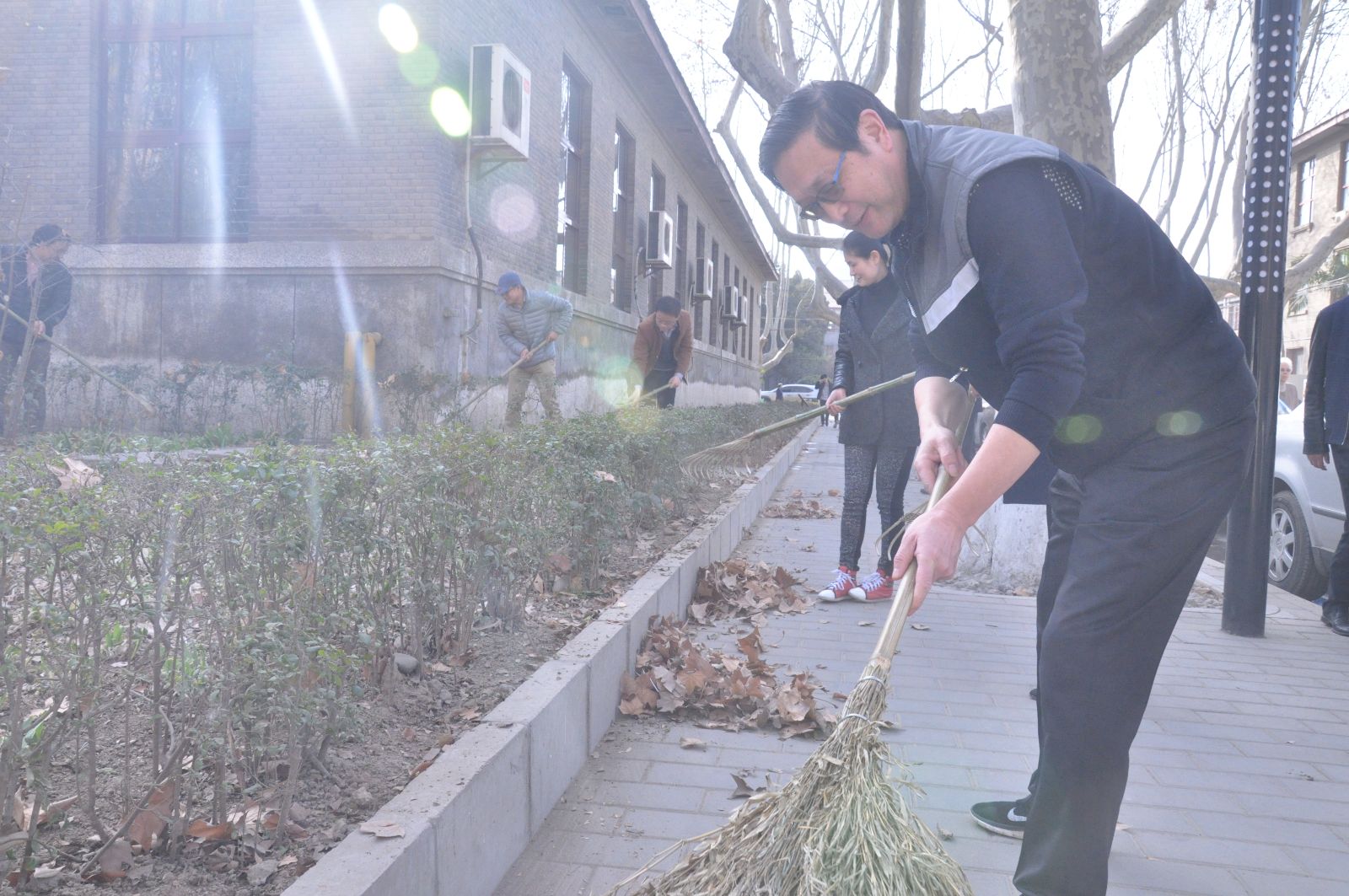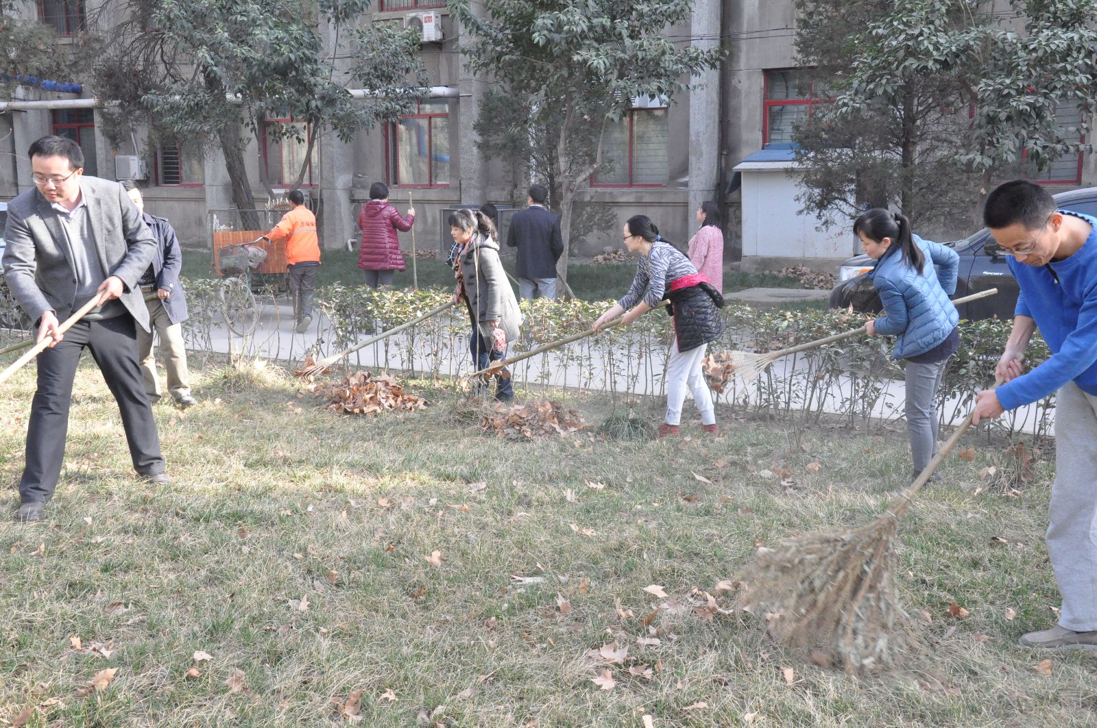 整洁校园环境迎校庆活动拉开序幕。在学院领导和7个系主任、支部书记的带领下,60多名教职员工齐上阵,大家人手一把耙子或扫帚,将绿花带、草坪以及小竹林中的落叶等垃圾清理出来。整个东二楼区域一派热火朝天的劳动景象。大家不怕脏不怕累,说说笑笑边劳动边交流,纷纷表示这样的集体劳动很有意义,表现出大家对学校发展的热爱,对双甲子校庆的期盼,更体现出作为交大人的责任感和使命感。