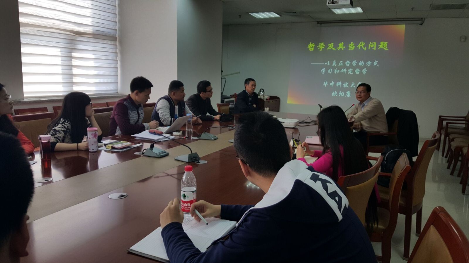 下午在主楼E610,欧阳康教授针对哲学及其当代问题与我校哲学系研究生展开深入讨论。他用自己的人生经历来引导学生们思考怎样用生命来体验和领悟哲学,并与在座的研究生探讨了有关哲学的争论与产生条件、哲学思维的特点、哲学的基本规定性、当前我国哲学的研究等问题,激起了同学们的交流热情。欧阳老师深入浅出地分析,一一化解同学们在学习研究中遇到的困惑。