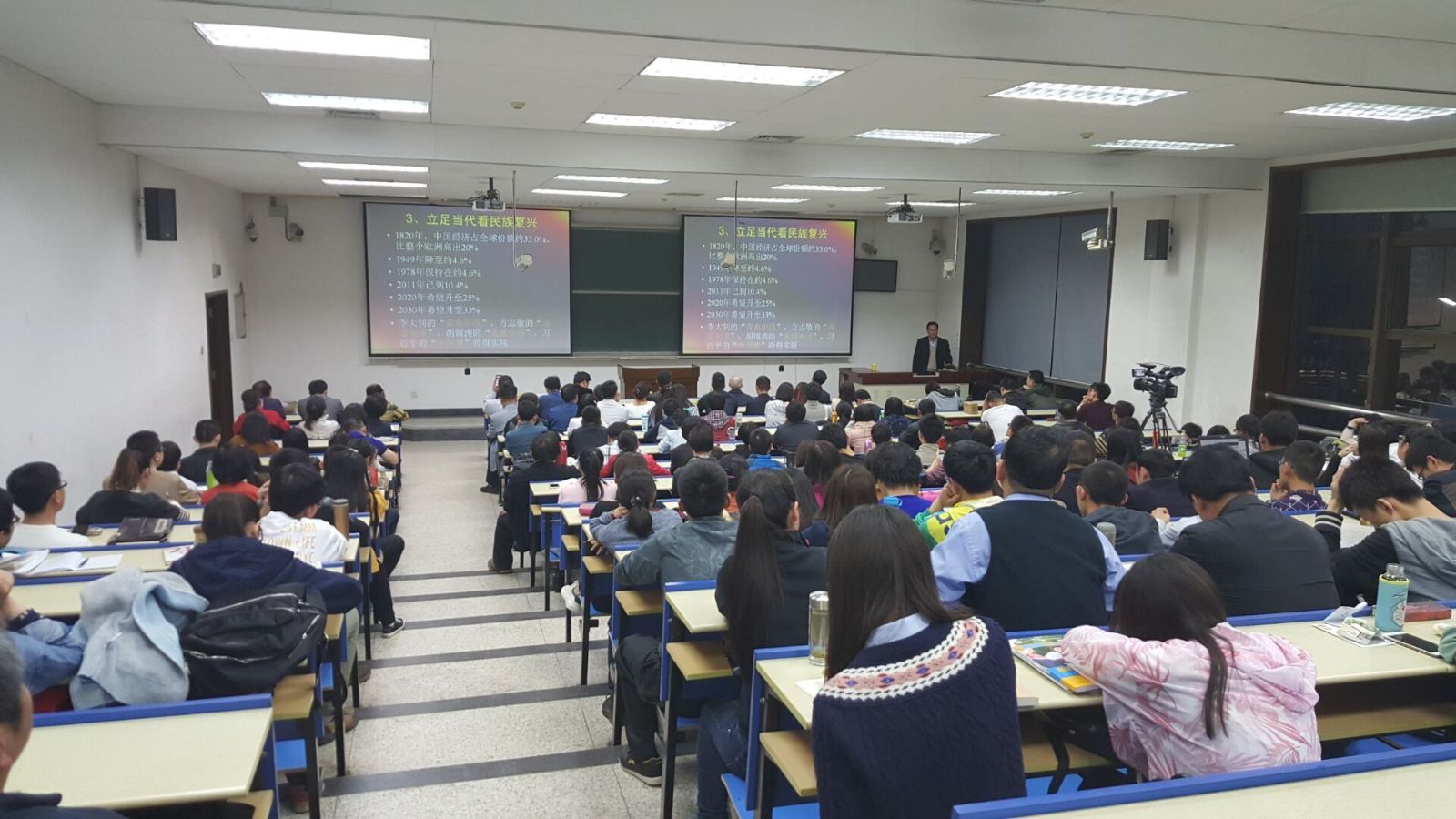 晚上7点,欧阳康教授在A203为全校师生带来了题为时代挑战和中国未来的学术报告。他从伟大的中国梦谈起,认为中国的民族复兴首先要面对的就是世界的现代化。现代化本来具有理性化、工业化、市场化、都市化、民主化、法制化等含义,而现代的价值并不是中立的具有二重性特征。面对现代化的发展,人们应深刻地看到当代资本主义的特点及其挑战,对于国际形势作出中国的解读。欧阳康教授还从苏联解体与美国崛起这两个重要背景出发阐述了中国和平崛起的可能性。中国尽管已经取得了很辉煌的成就,但着眼于全面建设小康社会的决胜阶段,经济发展还面临许多问题。而意识形态的冲突、地缘政治的复杂性、价值的多元化都为中国的和平崛起带来了隐患。最后他提出人们必须以复杂性思维看世界,深刻把握全球变局,争取话语主导权;不断探索中国价值,创新中国道路。这样才能提升中共在全球化时代治国理政境界,加速中华民族的伟大复兴。在互动环节,同学们积极响应。在结束后,很多同学还不愿离去,围着欧阳康教授交流看法。