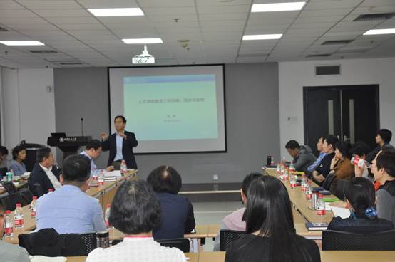 杨处长首先介绍了如何提升人文艺术通识教育内涵建设,从“通识教育+宽口径专业教育”的人才培养模式解读、国外大学的学院设置、我校当下通识教育课程现状三方面展开,认为我校目前人文艺术通识课程建设主要存在五点问题:教师和学生的通识教育理念不到位,没站在基础和育全人高度理解通识;课程通识性不够:课程体系结构性弱、考核随意,教师归属感不强,学生评价整体不高;课程外的其他环节不丰富,没有形成体系化;通识课程体系不足以支撑“通识培养目标”。他还指出,要切实提升通识课的内涵建设,打造真正的通识课,从四个方面下手:首要,加强学习、研究,利用好公众号、课程群、会议、论坛、讲习班等平台;其次,树立通识课是国产探花