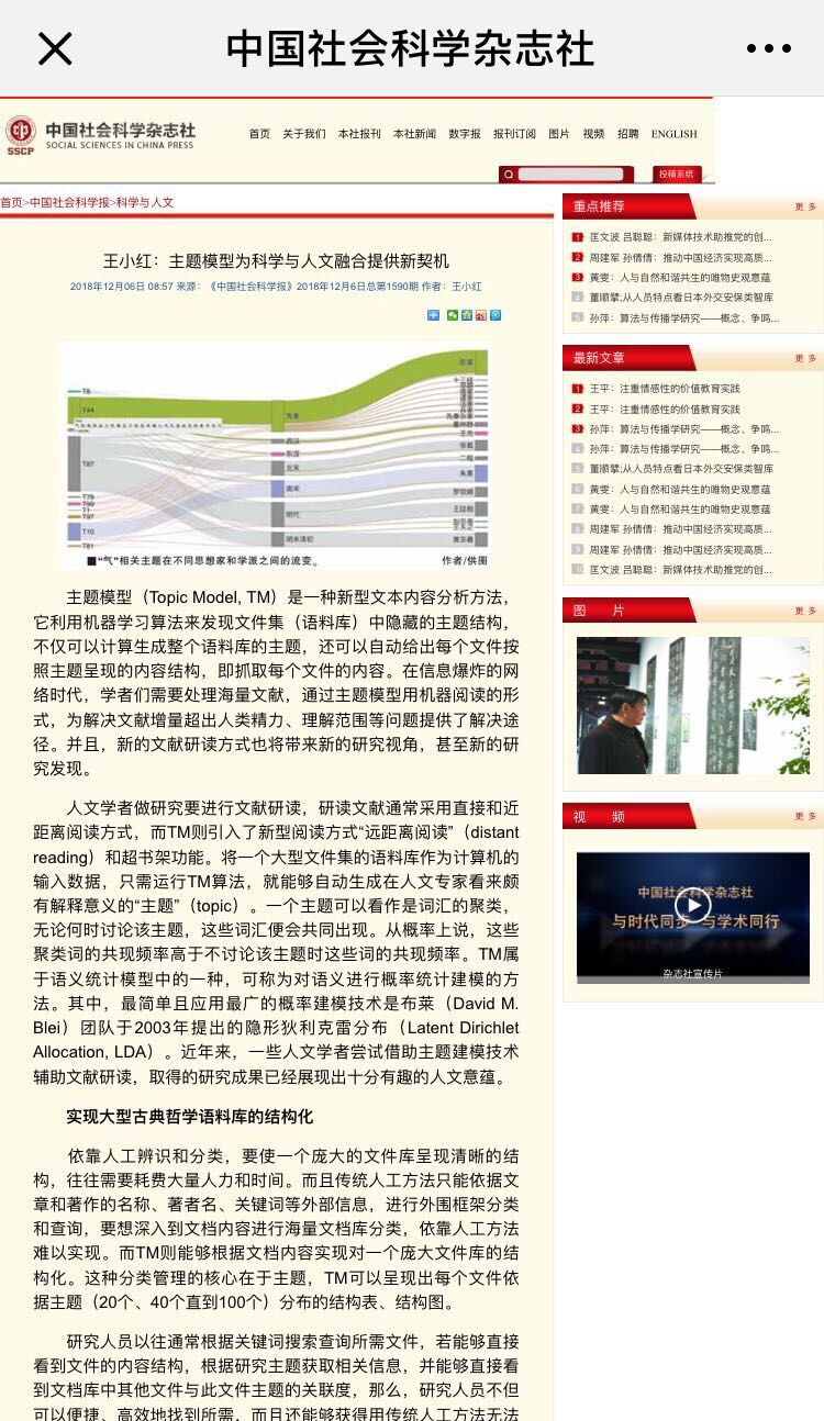 人文学者做研究要进行文献研读,研读文献通常采用直接和近距离阅读方式,而TM则引入了新型阅读方式“远距离阅读”(distant reading)和超书架功能。将一个大型文件集的语料库作为计算机的输入数据,只需运行TM算法,就能够自动生成在人文专家看来颇有解释意义的“主题”(topic)。一个主题可以看作是词汇的聚类,无论何时讨论该主题,这些词汇便会共同出现。从概率上说,这些聚类词的共现频率高于不讨论该主题时这些词的共现频率。TM属于语义统计模型中的一种,可称为对语义进行概率统计建模的方法。其中,最简单且应用最广的概率建模技术是布莱(David M. Blei)团队于2003年提出的隐形狄利克雷分布(Latent Dirichlet Allocation, LDA)。近年来,一些人文学者尝试借助主题建模技术辅助文献研读,取得的研究成果已经展现出十分有趣的人文意蕴。