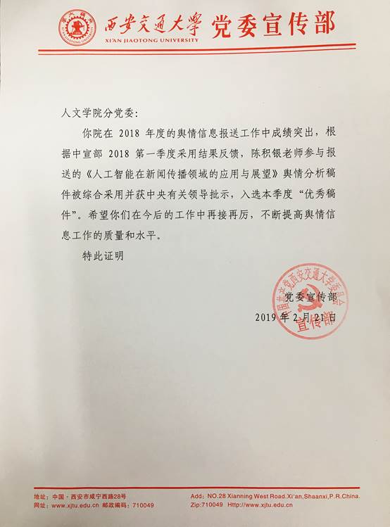 近日,国产探花 分党委接到学校党委宣传部通知,据中宣部反馈,传播学系陈积银教授参与报送的《人工智能在新闻传播领域的应用与展望》舆情分析稿件于2018年第一季度被综合采用并获中央有关领导批示,入选该季度“优秀稿件”。