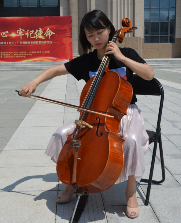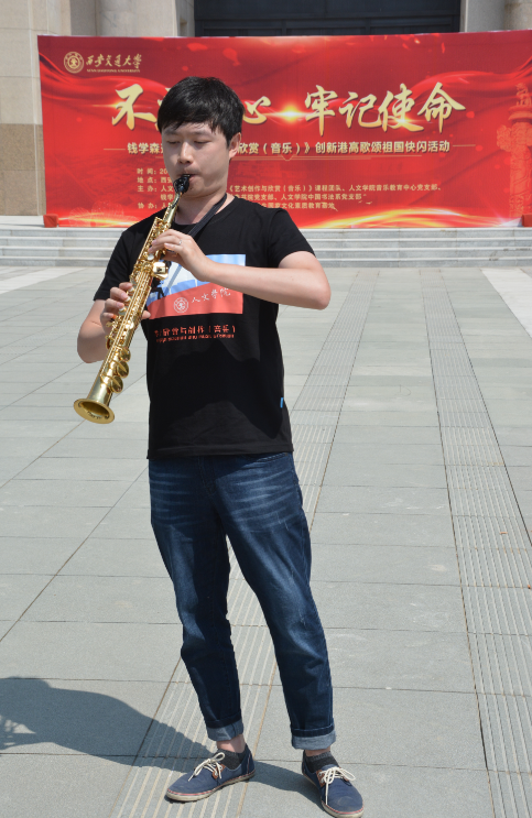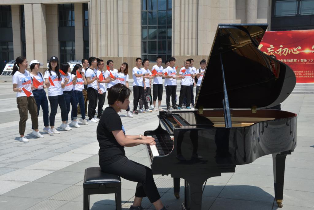 乐音共唱和——演奏,在广场中央,清澈的旋律从一架三角钢琴轻轻流出,从演奏者的指端飘荡于创新港的上空,深情的大提琴拉奏出悠长的《共和国之恋》的主旋律,萨克斯管高亢、清丽的声音盘旋于广场的角角落落,学子们和着琴声在哼鸣声中慢慢步入广场中心,让心中的梦想随着乐音飞扬、唱和!