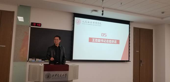 最后,王劲副书记对本次大会进行了总结,他首先祝贺新一届人文研会的成立,希望加入研会的同学们作为先锋队,在创新港这片土地上建功立业,担负使命,勇于面对挑战,使人文研会继续走向辉煌,做出留下历史印记的贡献。王劲副书记也为大家今后的工作提出三点希望:一是希望大家牢记职责,梳理好本部门的工作计划,不断学习,不断成长,做好老师和同学之间的桥梁,使研会成为同学们自我服务、自我管理、自我学习的组织;二是希望大家处理好工作和学习的关系,做好工作的同时不要耽误学习,要合理分配时间,让工作和学习互相促进,实现自身全面的发展;三是希望大家加强工作方法的学习,虚心学习学长学姐、其他学院、其他学校的经验,开阔眼界,使之与自身工作相结合,为今后开展活动积累丰富的经验,同时各部门之间要加强联系、群策群力、互相帮助,不断扩大研会的影响力,争取在学生服务、学校建设等方面取得突出成果。