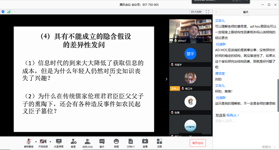在网络问答互动环节,对听众提出的相关问题,刘少杰教授从结论的获取方法,到对理论研究与经验研究、网络社会与现实社会的理论探讨,再到网络应该如何发挥引导作用来增强社会凝聚力的现实问题等等,均一一耐心解答。来自本校和外校的师生们针对讲座内容发表了很多自己独到的见解,线上讨论十分热烈,腾讯会议与学术志平台上参与人次超过6300人。