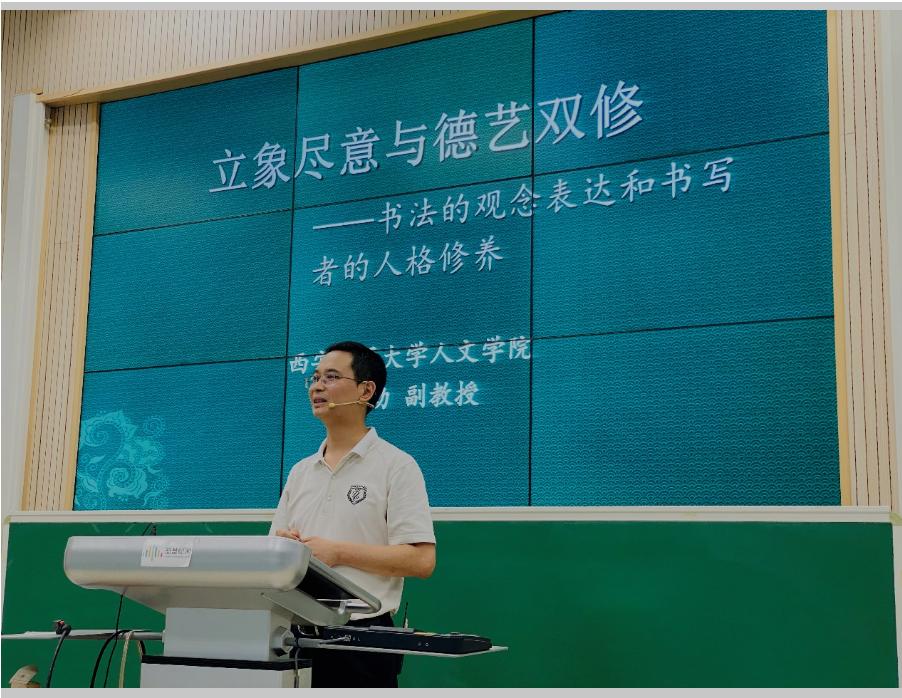 在授课过程中,王劲老师带领同学们探讨了汉字创造和发展过程中的意象思维,以及书法形式美中蕴含的意象智慧,感受着不同类型书法作品背后的中国传统文人的风骨和精神。王老师指出,学习书法有技法训练、文化践行、人格修养和社会担当四个层面的功能,模仿先贤法帖是进行技法训练的必有之路,在技法训练中还需要学习并践行技法背后所蕴含的文化理念,先贤法帖的精神气质和文化观念会涵养学习者的人格、陶冶学习者的情操;还有很多优秀的文化人,他们从事书法艺术不仅具有艺术追求,更重要的是具有深沉的社会担当,比如于右任先生书写魏碑体楷书就是为了追求魏碑中的“尚武精神”,以此来提升民族精神,而他创立“标准草书”则是为了提升国人的文字书写效率。