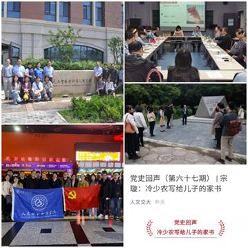 开展新教职工“学校史立师德”活动,通过实地观摩校园、学习校史校情,鼓舞青年教职工立志笃行,共担使命;学院党委组织师生观看党史题材电影《古田军号》和《第一大案》;每月举办一期干部读书班活动,领导干部带头系统学、深入学,联系实际开展研讨;每月在师生党支部中举办两期“学党史·强信念·跟党走”党史学习教育读书会,由师生领读《论中国共产党历史》《改革开放简史》《交通大学西迁》等党史校史书籍;利用“人文交大”公众号平台开展“党史回声”“音乐回声”系列活动,邀请100名师生党员,通过朗诵、歌曲的形式回顾建党百年中的星火点滴。“古田会议”“毛泽东与红双井”“平型关战役中的一条军毯”“黄继光的惊天一跃”……师生按图索骥,循着故事背景、人物线索,逐渐了解小故事背后的宏大历史叙事,感悟、学习中国共产党人在长期奋斗中形成的强大精神谱系和鲜明政治品格。