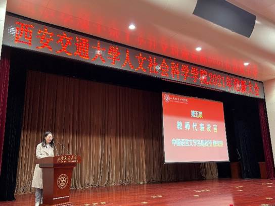 教师代表中文系魏琛琳老师将大学的求学之路比作“万山围子”,而就如何面对“万山围子”里“一山放过一山拦”的磨砺,魏老师从三个方面分享了自己的经验和思考:一是用诗意丈量生活的广度,二是以赤诚体悟学术的温度,三是借理想架起道德的高度。魏琛琳老师认为,坚守本心、不忘初心,才能在广阔天地大有作为。“此心安处即吾乡,愿交大成为我们每一个人心灵栖息的地方。”魏老师借苏轼之言传达了对同学们的美好祝愿。