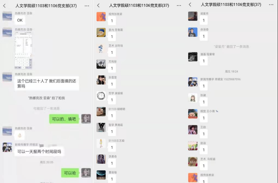 硕1103和1106党支部组建考研抗疫志愿者队伍,短时高效聚集支部力量,共有29个人申请加入志愿者队伍,参加志愿服务总时长超过110小时,积极主动承担抗疫责任,在各个岗位认真负责,无不展现人文学子的热情与风采。