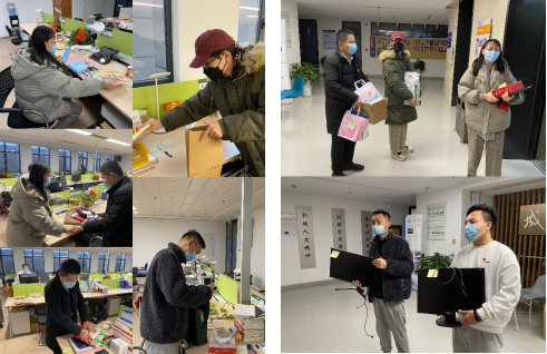 志愿者按照校纪校规要求,统计院内同学物资需求清单,用共享表格等手段高效完成统计工作,并依据清单内容在各教研室装取电脑、键盘等科研必备工具,为物资贴标签。