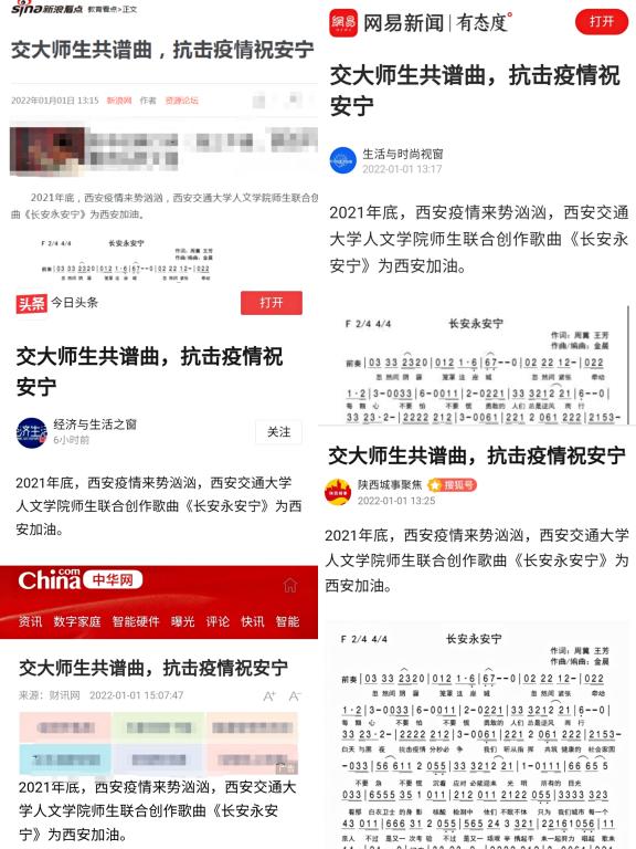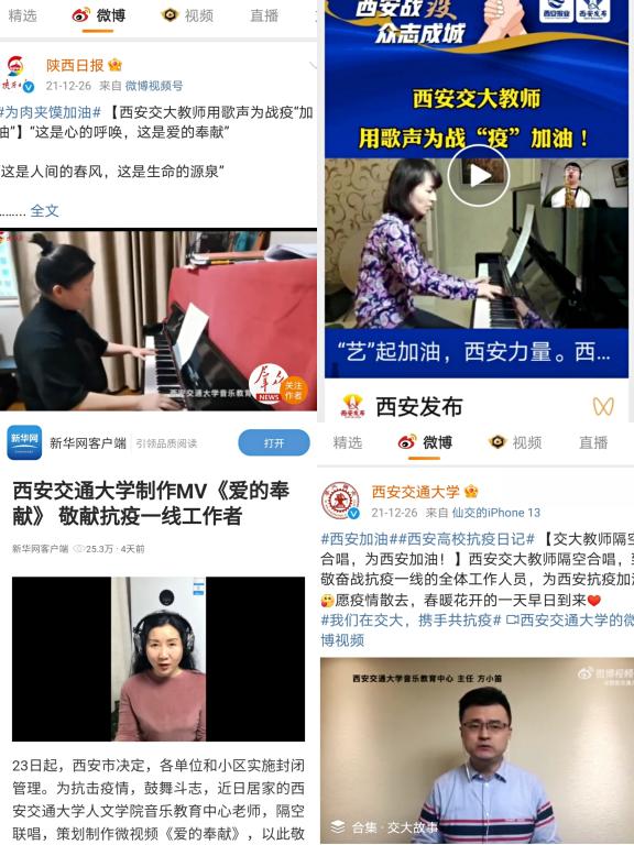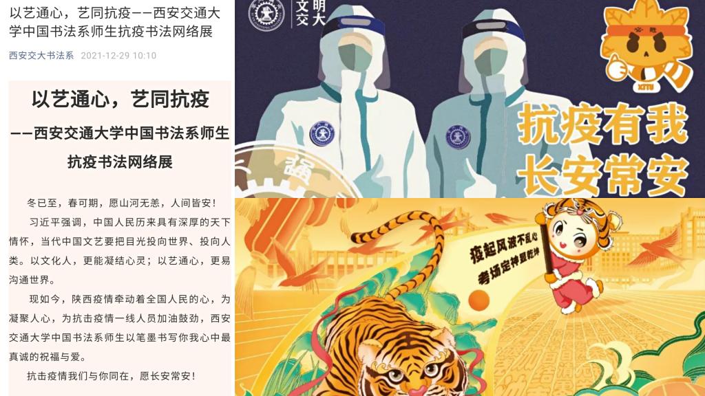 作为承担学校文化建设重点任务的单位,以文艺创作为抗疫加油是重大的政治责任。音乐教育中心教师联合校内师生隔空创作表演歌组曲:《爱的奉献》《长安永安宁》《光·明》,用歌声表达了对抗疫一线工作人员的敬意,对全市人民齐心抗疫的心声,和对这座千年古城的祝福,作品在各大网络平台发布后点击量快速突破30多万次。中国书法系举办“以艺通心,艺同抗疫”书法作品网络展,引导师生创作书法作品,以文化人,以艺通心,助力抗疫。艺术系教师通过引导学生创作海报、抗疫头像、日常空间再设计等方式,配合学校做好疫情期间的宣传与设计工作,传递抗疫暖心正能量。社会心理学研究所王瑜萍副教授撰写抗击疫情科普小贴士,引导师生服务大局,科学防疫。国产探花