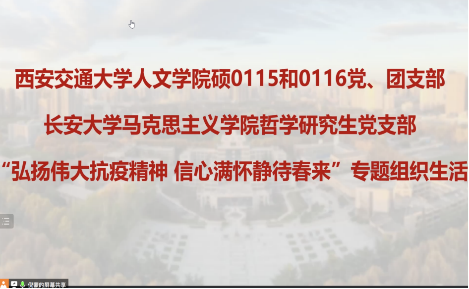 硕0115和0116党、团支部联合长安大学马克思主义学院哲学研究生党支部,开展“弘扬伟大抗疫精神 满怀信心静待春来”专题组织生活,互通有无、互相学习、互相鼓劲,以崭新面貌抗击疫情,总结2020,迎接2021。