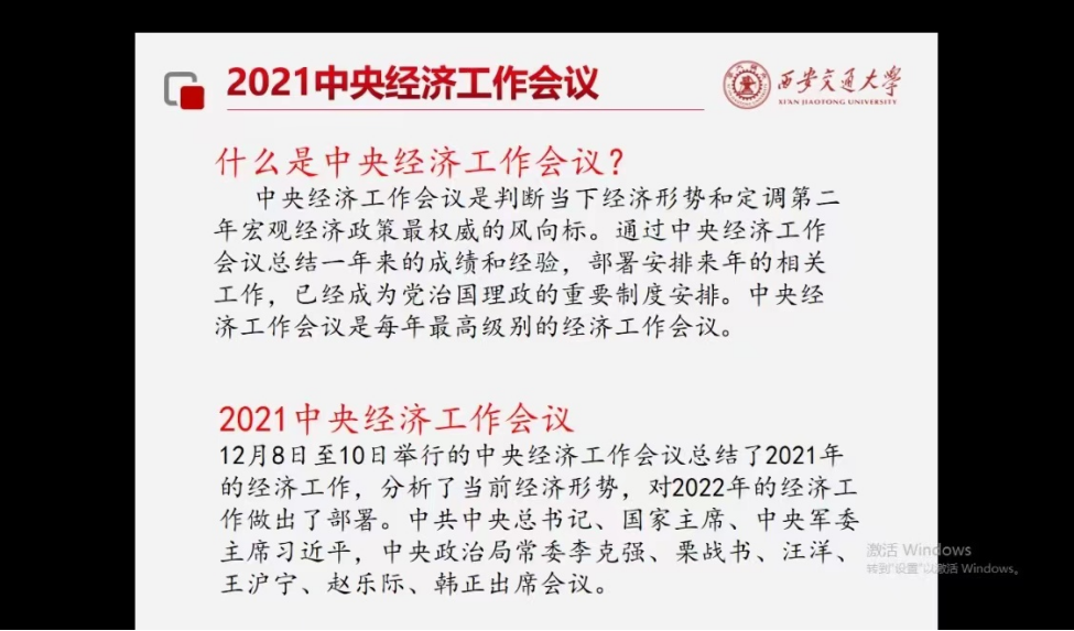 赵惜晨向大家分享了习近平总书记在中央经济工作会议上的讲话,她从总结2021年经济工作、当前经济形势、部署2022年经济工作三个方面向大家介绍了会议的主要内容。她谈到,要自觉同党中央保持高度一致,提高政治判断力、政治领悟力、政治执行力,必须学习历史知识、厚植文化底蕴、强化生态观念,也要把思想理论落实到实际行动上。