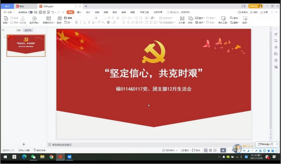 硕0114和0117党、团支部开展“坚定信心,共克时艰”组织生活会,学习习近平总书记在中国文联十一大、中国作协十大开幕式上的讲话和在中央经济工作会议上的讲话。受疫情影响,会议在线上召开,党支部书记邹铭聪主持会议,赵惜晨、蒋悦、杨紫嫣向大家分享学习内容。