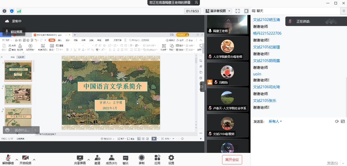 中文系副主任王学强副教授进行了专业介绍,讲述了学科历史、专业课程、课程团队、研究方向、研究机构及毕业生去向。重点介绍了中文系的学科特点。