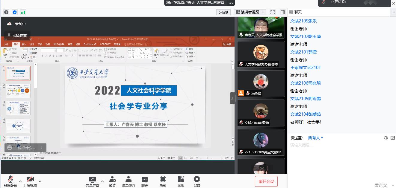 社会学系主任卢春天教授重点介绍了社会学专业培养特色、学术研究成就、师资队伍、保研、出国、就业方面等内容,希望同学们立志成为对社会有用的人才。