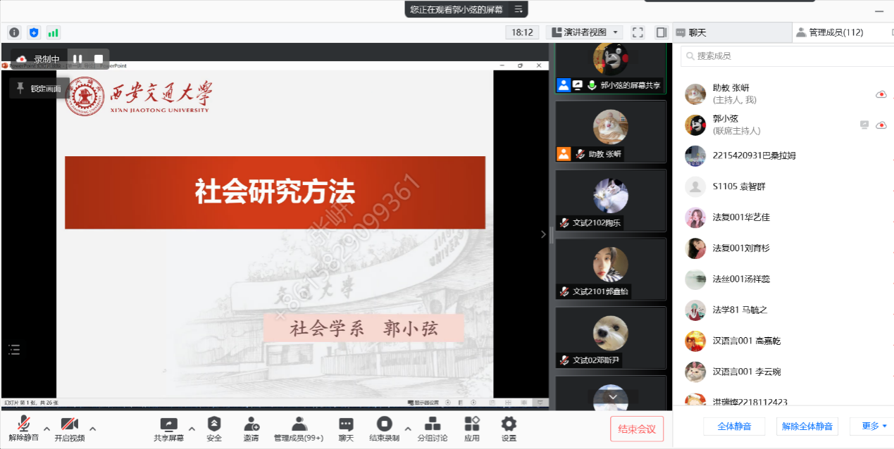 社会学系郭小弦副教授讲授的大类平台课《社会研究方法》,面向文科试验班大类本科生,是线上教学周的第一节课。上午和下午2个大班共计239名学生通过线上授课的方式完成了学习,其中包括2名国际留学生。200多人的网课是很大的挑战。接到网络授课通知后,郭老师在思源学堂发布了课程相关信息和微信群二维码,郭老师和两名助教在课前多次确认,确保每一位学生收到了课程信息。网络教学井然有序,课间助教随堂签到,同学们的在线提问也能够及时得到回答,同学们顺利完成了春季课程教学周第一天的学习任务。