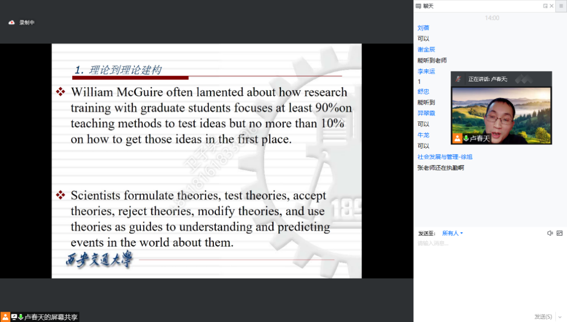 社会学系研一的卫子昊同学说:“在老师和助教的精心准备下,课堂内容生动形象,老师旁征博引,向大家讲解了科学理论的本质是什么以及理论在社会研究中的重要性。在抗击疫情的特殊时期,身为西交学子,更应当不忘初心,刻苦钻研学习,发扬西迁精神,走好人生之路”。