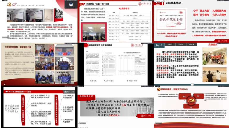 硕1104和1105党支部书记王彦清介绍了支部在2021年进行的各项党团活动,对支部存在的诸如与群众联系不够紧密等不足进行了反思,并对后续将实施的工作进行规划。硕1103和1106党支部开展了丰富多彩的支部活动,该支部发扬了同学们的学科专业优势,将理论学习与艺术活动相结合。疫情期间,支部党员积极投入到志愿服务活动中,并响应国产探花