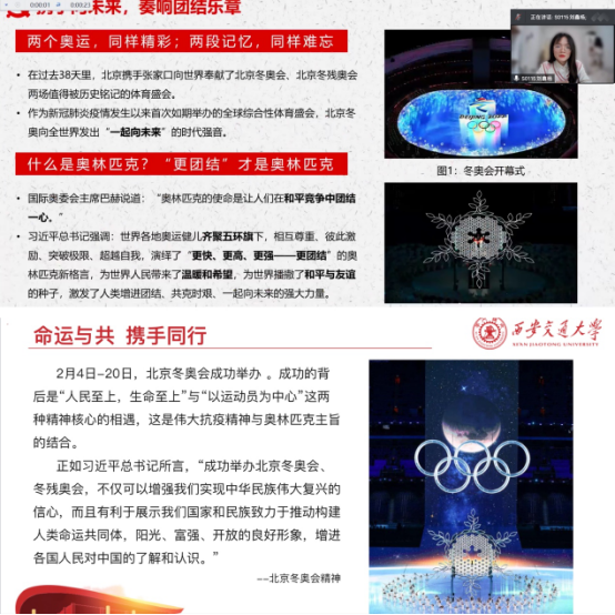 积极分子们从全球化的角度理解本次北京冬奥会,从而更深入地理解了习近平总书记提出的构建人类命运共同体的意义。慕冬冬说:“北京冬奥会成功举办的背后是‘人民至上,生命至上’与‘以运动员为中心’这两种精神核心的相遇,这是伟大抗疫精神与奥林匹克主旨的结合。正如习近平总书记所言,‘成功举办北京冬奥会冬残奥会,不仅可以增强我们实现中华民族伟大复兴的信心,而且有利于展示我们国家和民族致力于推动构建人类命运共同体,阳光、富强、开放的良好形象,增进各国人民对中国的了解和认识’。刘鑫扬认识到:“两个奥运,同样精彩;两段记忆,同样难忘”,北京携手张家口向世界奉献了北京冬奥会、北京冬残奥会两场值得被历史铭记的体育盛会。作为新冠肺炎疫情发生以来首次如期举办的全球综合性体育盛会,北京冬奥向全世界发出“一起向未来”的时代强音。国际奥委会主席巴赫曾表示,奥林匹克的使命是让人们在和平竞争中团结一心。习近平总书记也强调,世界各地奥运健儿齐聚五环旗下,相互尊重、彼此激励、突破极限、超越自我,演绎了 “更快、更高、更强、更团结”的奥林匹克新格言,为世界人民带来了温暖和希望,为世界播撒了和平与友谊的种子,激发了人类增进团结、共克时艰、一起向末来的强大力量。
