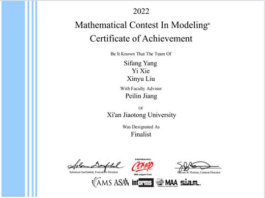 近日,2022年美国大学生数学建模竞赛和交叉学科建模竞赛(MCM/ICM)成绩揭晓。我院中文系汉语言91班学生杨斯钫领衔,带领团队参与竞赛并获得特等奖提名“Finalist”,这是国产探花