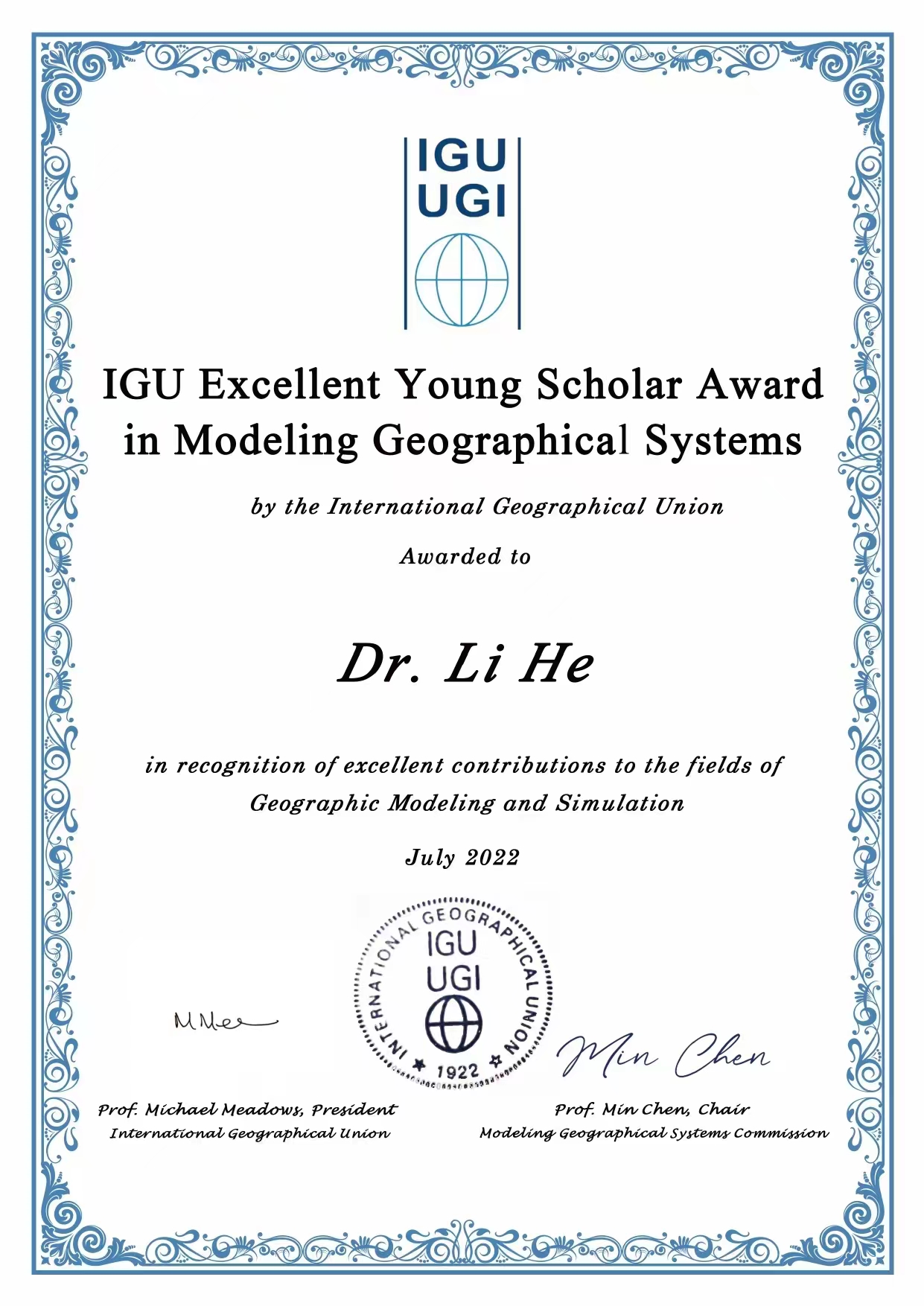 “优秀青年学者奖”是IGU MGSC面向全球从事地理建模及相关研究的青年学者所设立的一项学术荣誉,旨在表彰那些在其职业生涯早期就做出杰出学术贡献并且获得博士学位未满7年的优秀青年学者,每年在全球范围内仅评选出2名获奖者。