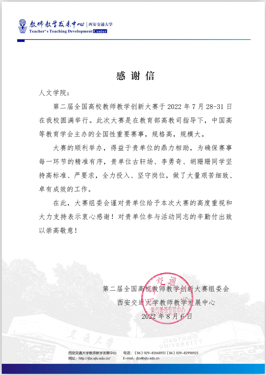大赛期间,我院古轩场、李勇奇、胡珊珊三位同学自愿参加志愿服务,坚持高标准严要求,尽职尽责完成工作任务,大赛组委会对三位志愿者同学对本次大赛的支持表示感谢,特写来感谢信。希望受表彰的同学再接再厉,积极参与学校的工作,在今后的学习和工作中取得更大的成绩!