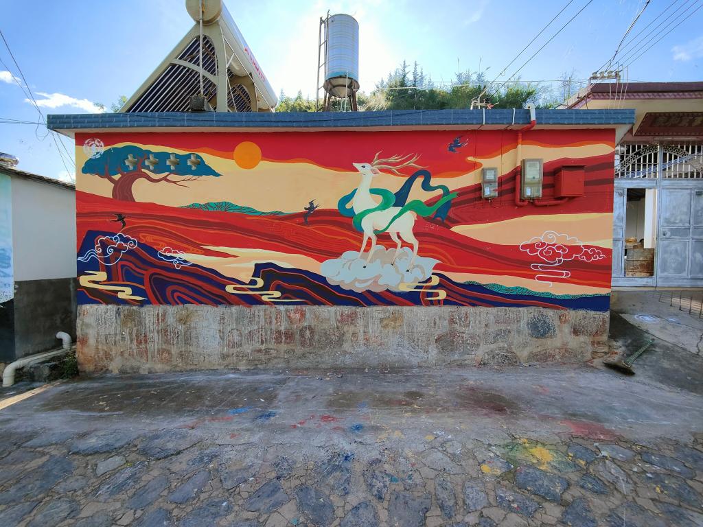 团队成员来到姚关镇山邑村调研墙绘场地,在县文化馆和村里干部的带领下实地勘查并确定墙绘小稿。经与村干部探讨,队员们制定了名为《中国风——神鹿》的设计方案,整体设计中力图展现“家教”“中国传统”等背景意义,选择了大家较为熟知的“鹿”作为主题,墙绘以红色为主色调,与周围茂盛的绿植形成鲜明的强对比。画面最中心的鹿象征了老百姓对富足生活的向往,以及百姓像鹿一样昂扬的精神面貌。画面中的山石、松柏,有坚强不屈、健康长寿的寓意;燕子、祥云则寄托了喜庆吉祥的祝福。墙绘将中国传统绘画中的元素与现代国潮元素相结合,希望能够在保留国风传统的同时,吸引更多的年轻人前来打卡,带动乡村经济发展。