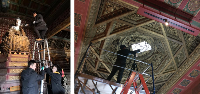 通过对该研究中心欧阳振宇和陈强两位老师的采访,我们得知该团队目前还有多项在研的国际合作项目,如“北京智化寺海外藏藻井的数字化原境还原研究”、“昭陵六骏造型复原及原境再现研究”、“广胜寺壁画数字重构研究”项目等。其中北京智化寺藻井的数字化原境还原项目已接近尾声,该项目历经四年时间,期间组织实施了两次长时间的海外数据采集,最终通过虚拟现实技术解决了北京智化寺藻井与建筑大木作长期分处中美两国的研究窘境,完成了北京智化寺万佛阁、智化殿藻井的数字化原位复原,首次实现了我国流散海外大型不可移动文物的数字化原境还原研究。