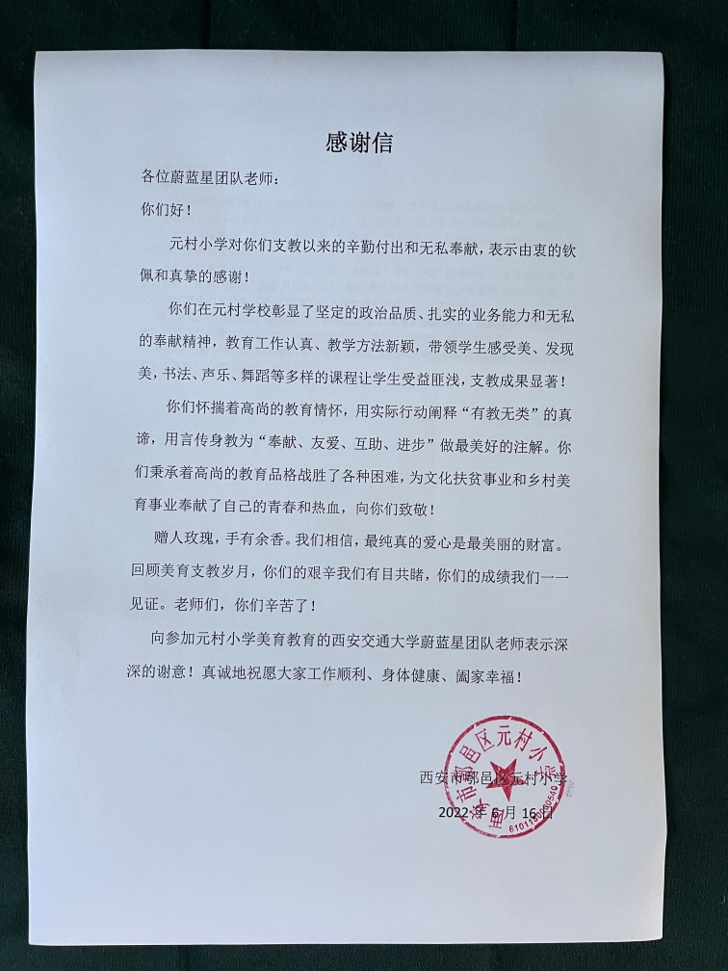 学生们的才华,也彰显出莘莘学子昂扬向上、奋发有为的精神风貌,以及服务社会的意识,获得当地人们的高度赞赏。团队的努力获得了当地村民及该校师生的一致好评,并收到了该校的感谢信。蔚蓝星美育团队希望看到乡村孩子人人“心中有舞台,眼里有星光”。我们会为实现以美育促进并提升秦岭北麓乡村小学德育和智育的发展目标而不懈努力。